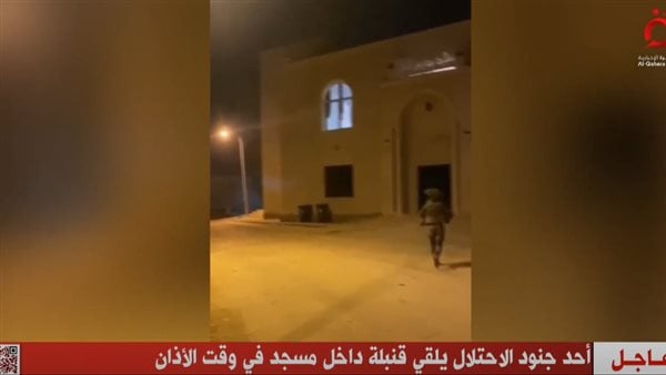 عرضت قناة القاهرة الإخبارية، مقطع فيديو عبر شاشتها لأحد جنود الاحتلال الإسرائيلي اثناء إلقاءه قنبلة في إحدى المساجد بمدينة رام الله.