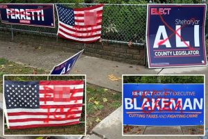 استهدف المخربون في لونغ آيلاند لافتات حملة الحزب الجمهوري، وكتبوا عبارة “F–k ICE” على العلم الأمريكي