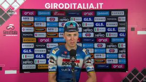 “يتفاعل تيم ميرلييه (Soudal Quick-Step) المبتهج مع فوزه بالمرحلة 18 من Giro du0027Italia بعد نهاية سباق نابضة بالحياة لسباق اليوم.…