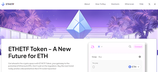 يشير موقع ETHETF Token إلى نية العملة أن تكون في الطليعة قبل طرح ETF الفوري لشركة BlackRock في السوق، وهو حدث من المتوقع أن يتسبب في انفجار سعر Ethereum (ETH) وجميع العملات المرتبطة به.