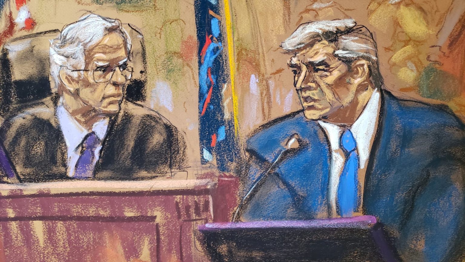 يتم استجواب الرئيس الأمريكي السابق دونالد ترامب من قبل القاضي آرثر إف إنجورون قبل تغريمه 10000 دولار لانتهاكه أمر حظر النشر للمرة الثانية، خلال محاكمة الاحتيال المدني لمنظمة ترامب في المحكمة العليا لولاية نيويورك في حي مانهاتن بمدينة نيويورك، الولايات المتحدة. ، 25 أكتوبر 2023 في هذا الرسم التخطيطي لقاعة المحكمة.