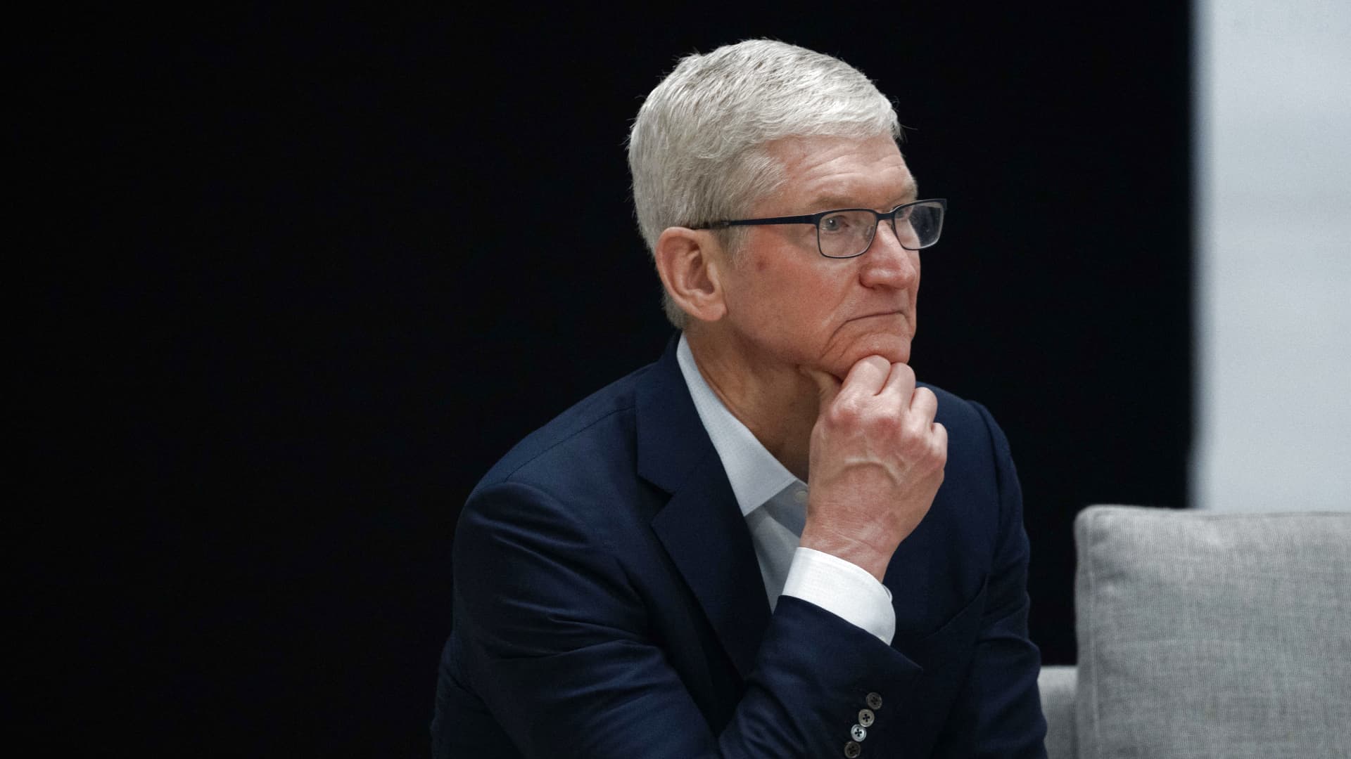 الرئيس التنفيذي لشركة Apple، تيم كوك، يتابع محادثة حول الصحة العقلية، خلال برنامج للزوجين في اليوم الأخير من أسبوع قادة منظمة التعاون الاقتصادي لآسيا والمحيط الهادئ (APEC) في Apple Park في سان فرانسيسكو، كاليفورنيا، في 17 نوفمبر 2023.