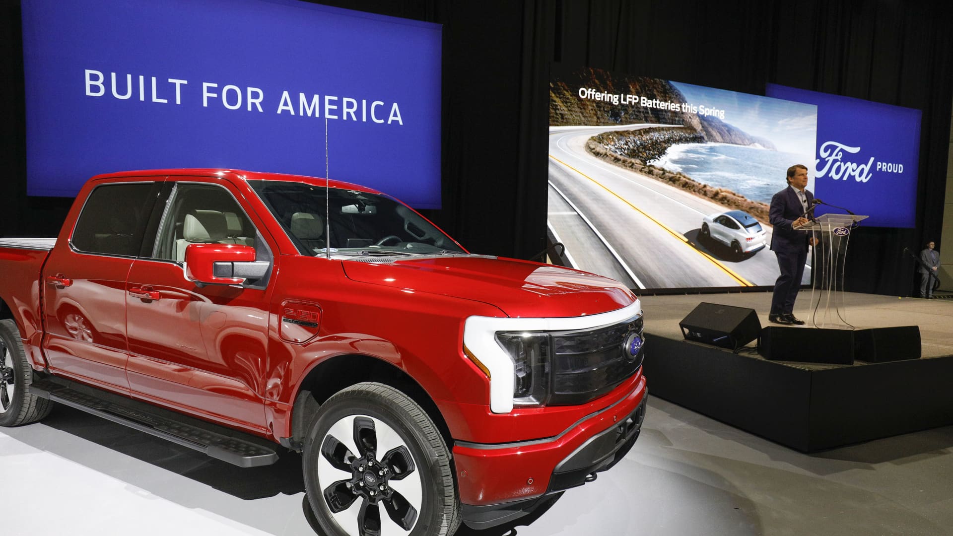 أعلن جيم فارلي، الرئيس التنفيذي لشركة فورد، في مؤتمر صحفي أن شركة فورد للسيارات ستدخل في شراكة مع أكبر شركة بطاريات في العالم، وهي شركة مقرها الصين تدعى Contemporary Amperex Technology، لإنشاء مصنع لبطاريات السيارات الكهربائية في مارشال، ميشيغان، في 13 فبراير. 2023 في رومولوس، ميشيغان.