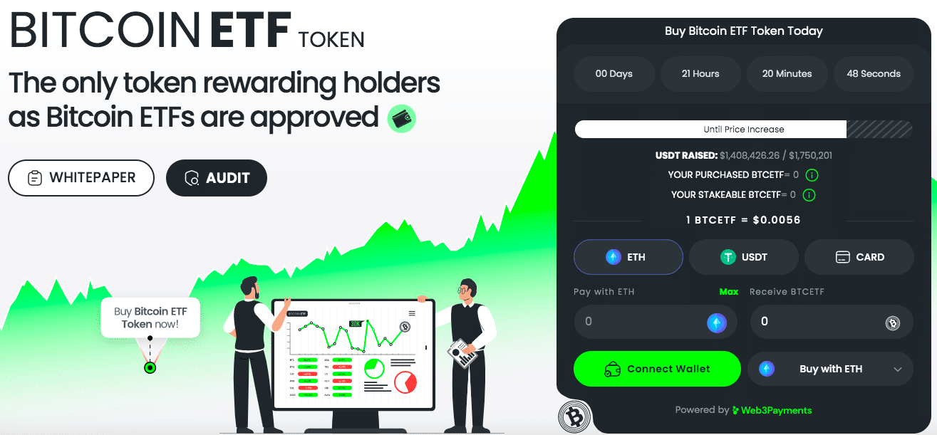 ليس هناك وقت نضيعه في وضع المحافظ الاستثمارية في ما يمكن أن يكون أحد أكثر اللحظات أهمية في تاريخ العملات المشفرة. يعد Bitcoin ETF Token خيارًا ممتازًا لمساعدة المستثمرين على التعرف على موضوع الاستثمار الفوري المربح لـ Bitcoin ETF، ولكن قم بإجراء الأبحاث الخاصة بك.