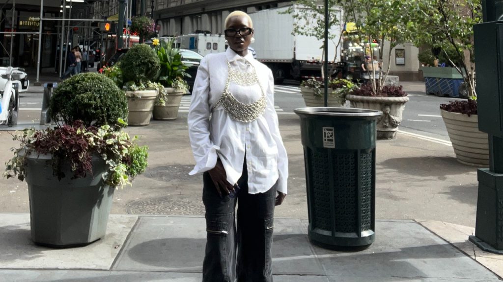 لكي أجعل مظهري خاصًا بي، من القطع الموجودة بالفعل في خزانة ملابسي، ارتديت بنطالي المحبوك باللون الكريمي والمزخرف قليلاً والمزخرف بأنماط مختلفة تمتد عبر البنطال لأعلى ولأسفل. بعد ذلك، أردت إضافة مستويات من الأشكال غير المتماثلة لإضفاء لمسة تحريرية. على فخذي سترة من قشر البيض مربوطة، ثقيلة لكنها خفيفة.