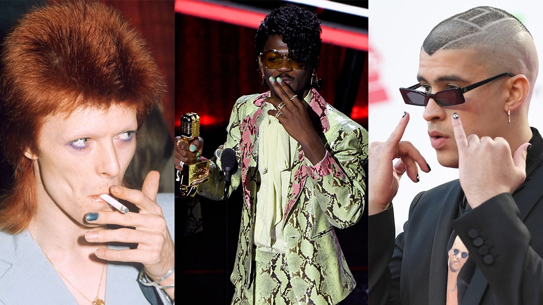 “في الأيام الذهبية لموسيقى الروك أند رول،”رجل“-icures” كانت في كل مكان. خلال حقبة زيغي ستاردست في أوائل السبعينيات، كانت أظافر ديفيد باوي باللون الأزرق المخضر تتناقض بشكل رائع مع شعر البوري الملتهب، بينما بدأ ستيفن تايلر، لاعب فريق إيروسميث، في ممارسة فن الأظافر الذي أصبح توقيعه الآن، مع خطوط سوداء جرافيكية. مهد الطريق لمتمردي الموضة في العقود التي تلت ذلك، وكان طلاء الأظافر المتكسر هو الدعامة الأساسية لكورت كوبين من نيرفانا في التسعينيات. في أوائل القرن العشرين، بدأ جوني ديب في أخذ صفحة من كتاب معبوده كيث ريتشارد بأرقام الكوبالت المطبقة بشكل عشوائي؛ قدم مغني “Kissed by a Rose” بديلاً أصليًا مع مانيكير أخضر لامع.