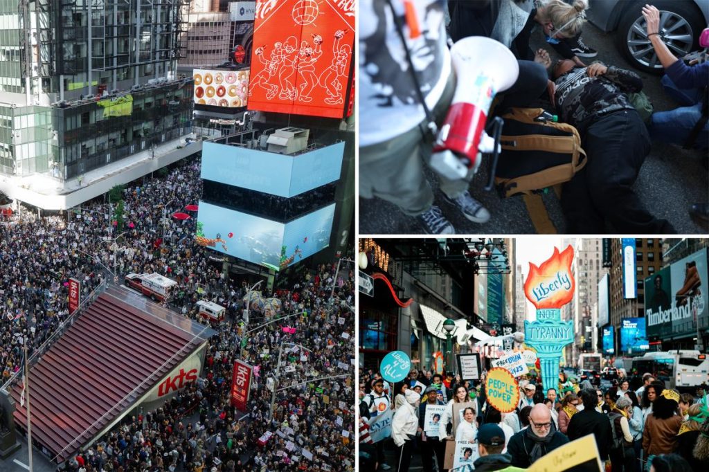 تدفق عشرات الآلاف من متظاهري “لا ملوك” إلى مانهاتن والمدن في جميع أنحاء البلاد وهم يلقون الألفاظ النابية ويلوحون بلافتات بذيئة يوم السبت احتجاجًا على الرئيس ترامب وسياساته.