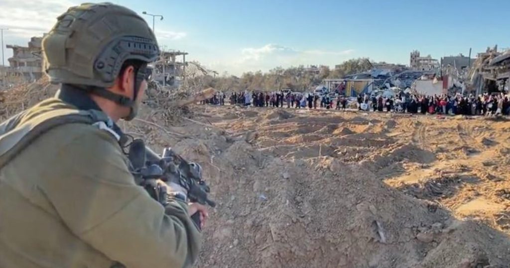 ويصرخ الجنود عبر مكبرات الصوت باللغة العبرية، ويسألون الحشد عما إذا كان هناك أي رهائن إسرائيليين بينهم ويطلبون منهم التلويح بأذرعهم والصراخ إذا تم تهريبهم إلى الجنوب.
