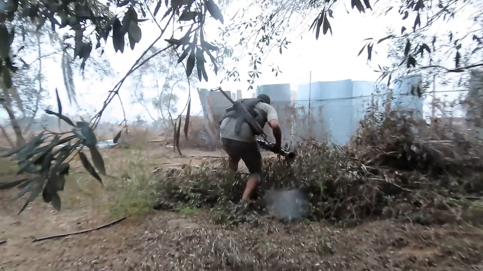 وظهر مقاتلو القسام وهم يتحركون بين الأشجار بملابس مدنية ومعهم حقائب صغيرة وأسلحة رشاشة وقذائف محمولة على الكتف، وقاموا بتوصيل سلك متفجر في المنطقة.