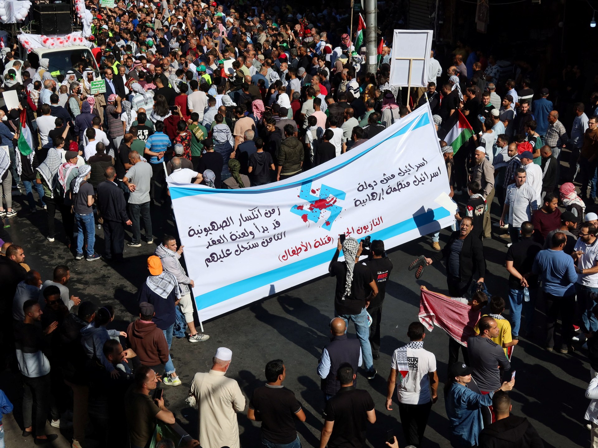 وردد المتظاهرون شعارات حيوا فيها المقاومة الفلسطينية وصمود الفلسطينيين على أرضهم، ووصفوا إسرائيل بأنها “منظمة إرهابية”، كما دعا المحتجون إلى وقف العدوان الإسرائيلي على غزة وإلغاء اتفاقية السلام بين الأردن وإسرائيل.