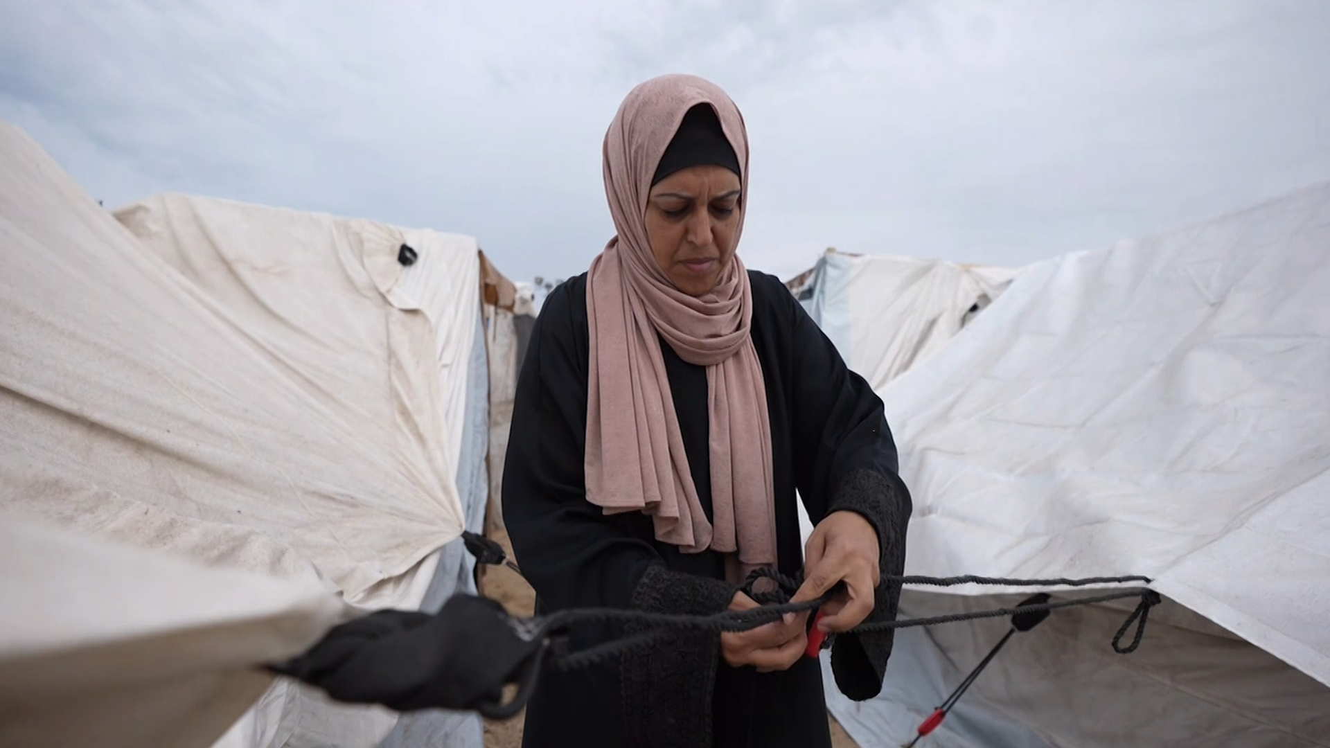 وترصد كاميرا الجزيرة ظروفا معيشية صعبة تعيشها السيدة هناء وأسرتها، حيث تقيم وأسرتها مع أسرة أخرى في إحدى خيام المخيم، التي لا تكاد تقيهم برد الشتاء، في حين تقوم مع أحد أبنائها بشد طرف الخيمة أملا في الحيلولة دون دخول ماء المطر.