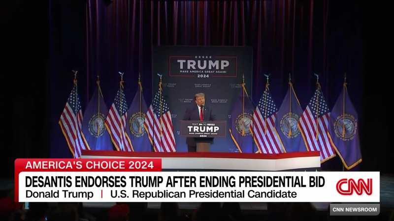 أعلن حاكم ولاية فلوريدا، رون ديسانتيس، تأييده للرئيس السابق دونالد ترامب، بعد أن أنهى ترشيحه لترشيح الحزب الجمهوري للرئاسة. تتحدث ألينا ترين من سي إن إن عن رد فعل ترامب على الإعلان.