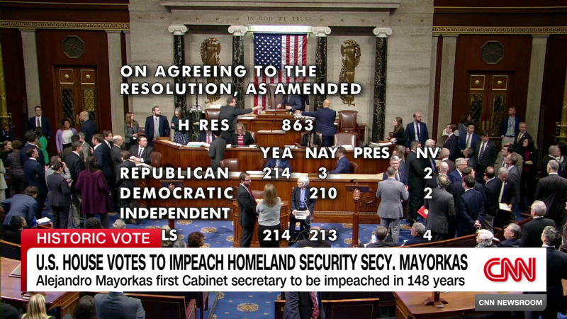 تقارير ميلاني زانونا من شبكة سي إن إن من واشنطن، حيث صوت الجمهوريون في مجلس النواب الأمريكي يوم الثلاثاء لصالح عزل وزير الأمن الداخلي أليخاندرو مايوركاس، وهو أول وزير في مجلس الوزراء يتم عزله منذ ما يقرب من 150 عامًا.
