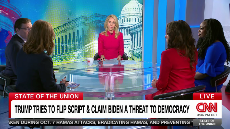 في برنامج حالة الاتحاد على قناة CNN مع دانا باش، رد المعلقون السياسيون في CNN، أليسا فرح غريفين، وكيت بيدنجفيلد، وآشلي أليسون، والخبير الاستراتيجي الجمهوري براد تود، على محاولة دونالد ترامب قلب السيناريو على الرئيس بايدن الذي وصفه بأنه تهديد للديمقراطية، وكذلك معركة نيكي هالي ورون ديسانتيس على المركز الثاني.