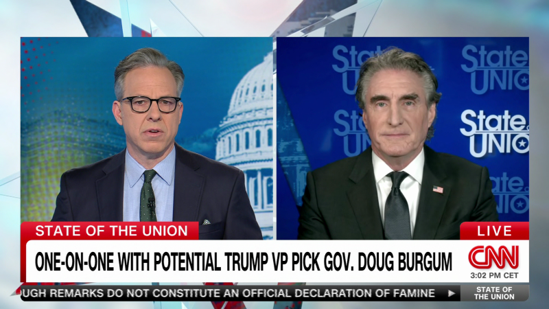 ينضم حاكم ولاية داكوتا الشمالية دوج بورجوم، المنافس المحتمل لمنصب نائب ترامب، إلى جيك تابر من شبكة سي إن إن بعد انضمامه إلى دونالد ترامب في حدث في مارالاغو وسط تكهنات محتملة لمنصب نائب الرئيس.