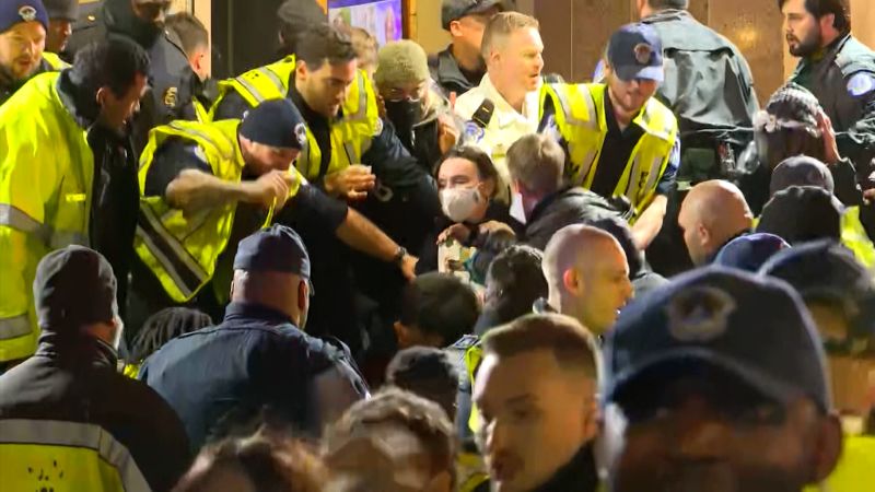 واشتبك المتظاهرون، الذين يطالبون بوقف إطلاق النار في الحرب بين إسرائيل وحماس، مع الشرطة خارج مقر اللجنة الوطنية الديمقراطية في واشنطن. تقرير غابي كوهين من سي إن إن.