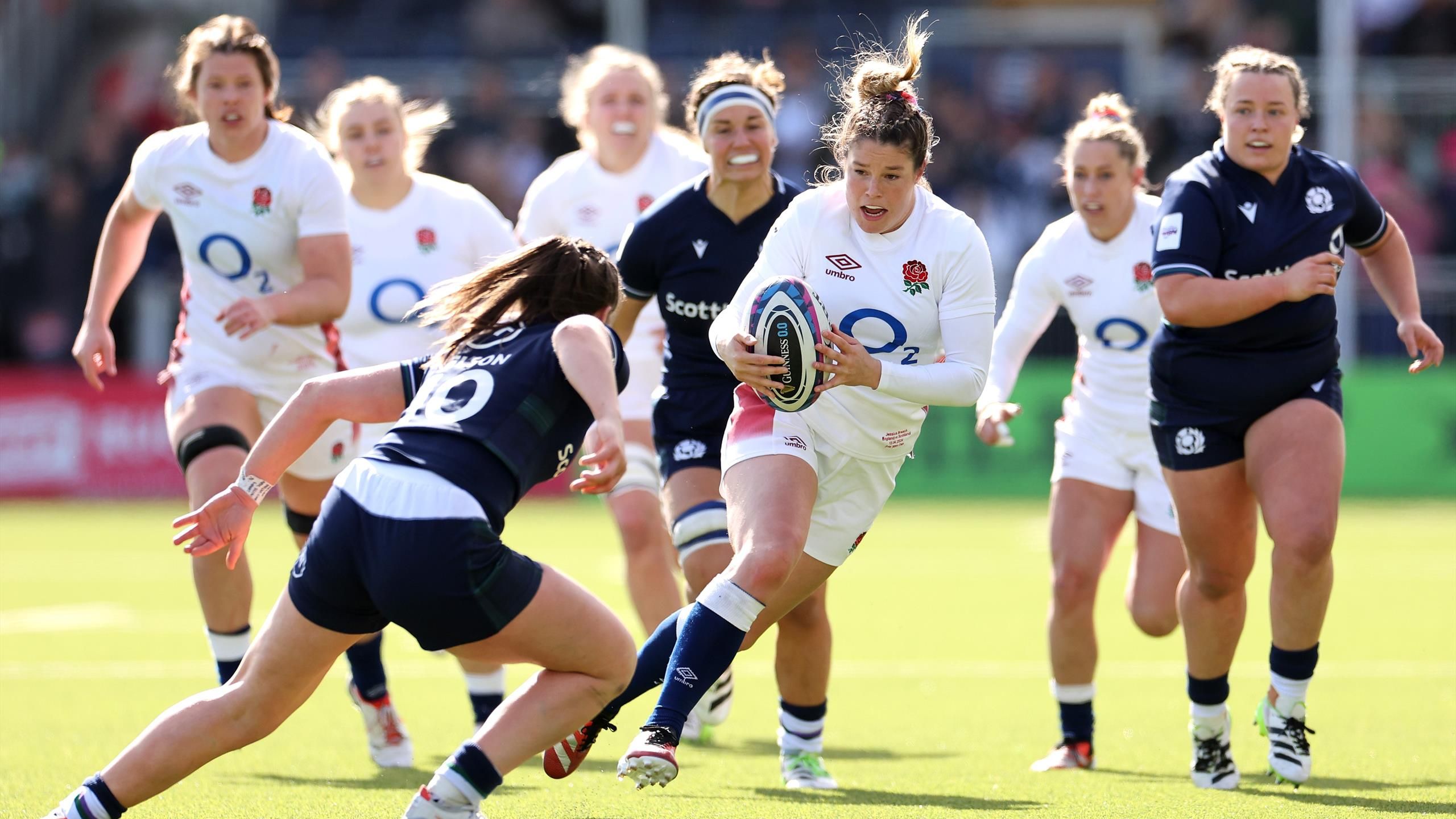 “واصل فريق الورود الحمراء بدايته الخالية من الهزائم في بطولة الأمم الستة للسيدات بفوز مهيمن 46-0 على اسكتلندا. كان عدد المشجعين البالغ 7774 مشجعًا في ملعب هايف في إدنبرة بمثابة حشد قياسي لمباراة الرجبي للسيدات الاسكتلنديات، لكن المشجعين المحليين لم يكن لديهم الكثير وفي مكان آخر، أنهت أيرلندا سلسلة من سبع هزائم متتالية في المسابقة بفوز واثق على ويلز.