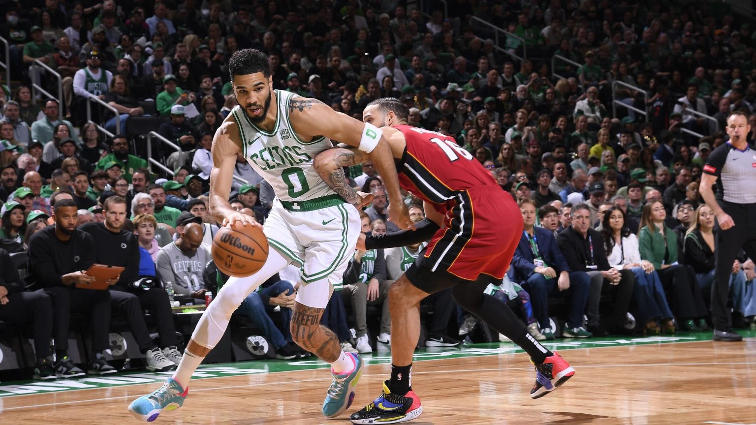 حقق فريق بوسطن سيلتيكس الفوز بنتيجة 114-94 في المباراة الافتتاحية لسلسلة تصفيات دوري كرة السلة الأمريكي للمحترفين على ميامي هيت في ملعب تي دي جاردن. وسجل جيسون تاتوم 23 نقطة واستحوذ على 10 متابعات و10 تمريرات حاسمة ليحقق ثلاثية مزدوجة ويقود فريقه إلى فوز مهيمن. كان فريق هيت بدون جيمي بتلر وتيري روزير، اللذين كان لهما دور أساسي في وصولهما إلى نهائيات العام الماضي، وستقام المباراة الثانية يوم الأربعاء في بوسطن.