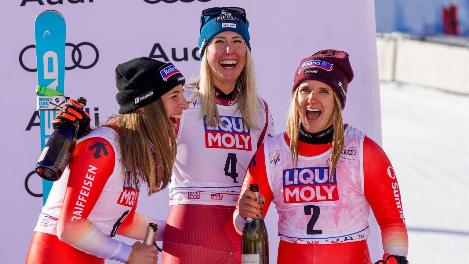 غابت ميكايلا شيفرين عن السباق ، بينما أنهت بطلة كأس العالم للانحدار صوفيا جوجيا المركز الرابع بفارق 0.44 ثانية وهي تتعافى من نزلة برد.