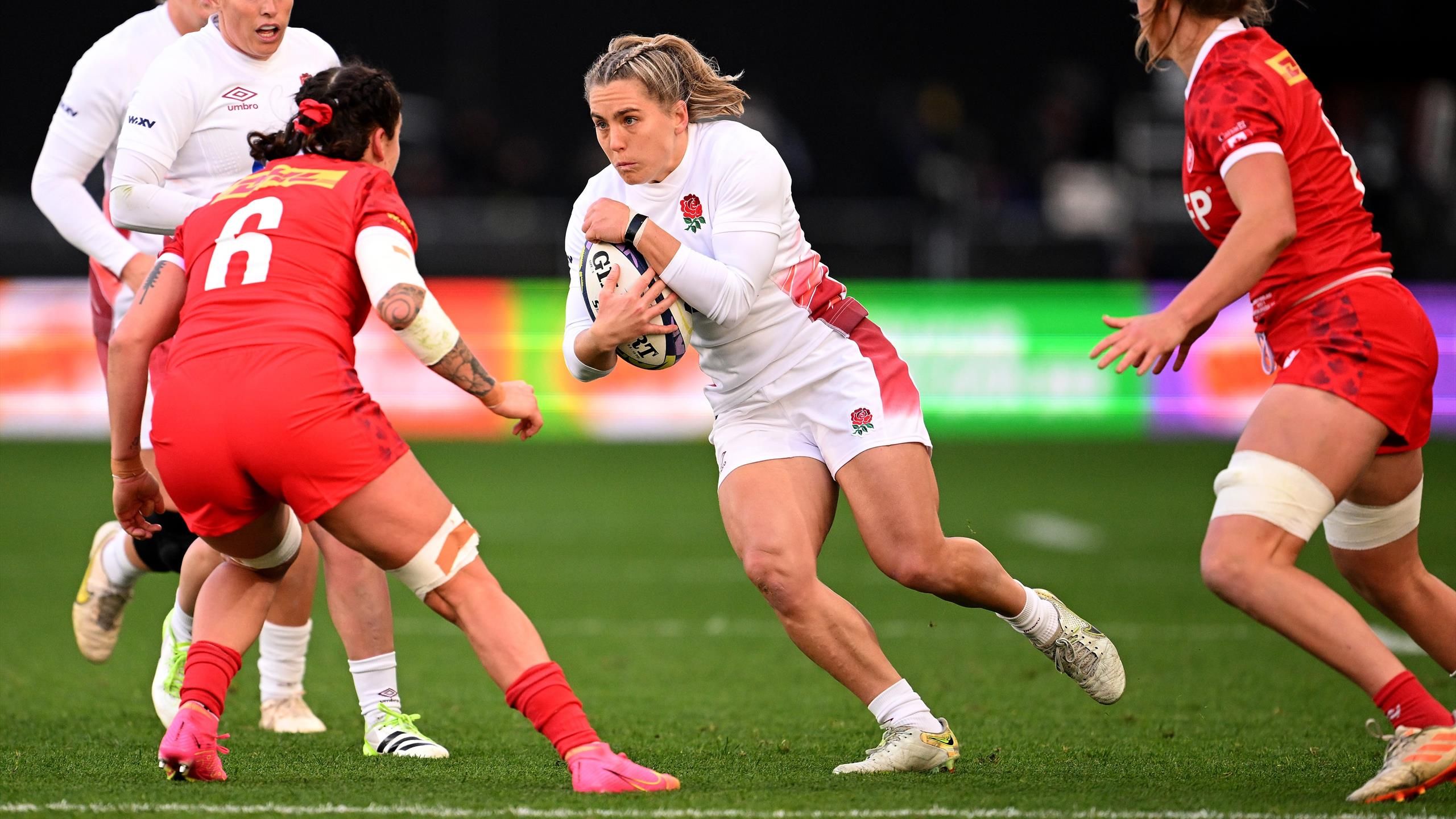 “تم استبعاد الجناح الإنجليزي كلوديا ماكدونالد من بطولة الأمم الستة للسيدات بعد تعرضه لإصابة في الرقبة أثناء اللعب مع فريق الرجبي التابع لفريق أليانز بريميرشيب للسيدات إكستر تشيفز. ماكدونالد، الذي سجل 16 محاولة في 32 مباراة مع ريد روزز، سيشاهد مباراة متخصصة ولكن ليس لديها إطار زمني محدد للتعافي. لقد غابت أيضًا عن بطولة الأمم الستة لعام 2022 بسبب إصابة في الرقبة.