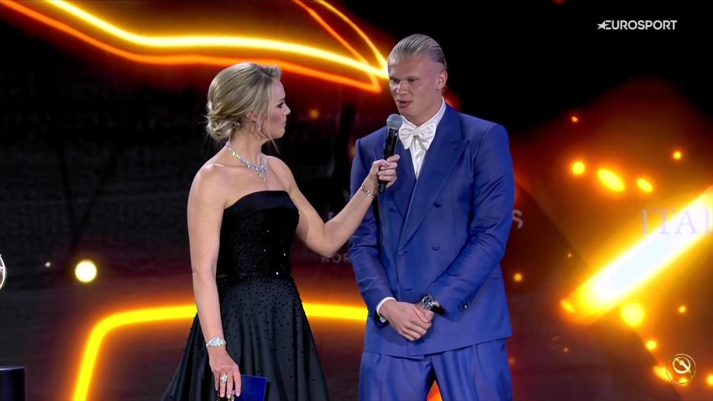 “تألق إيرلينج هالاند في عام 2023 أدى إلى حصوله على جائزة أفضل لاعب في العام في حفل توزيع جوائز جلوب سوكر في دبي، والذي تم بثه مباشرة على قناة تي إن تي سبورتس. وقد حصل المهاجم النرويجي على الجائزة احتفالاً بتسجيله 52 هدفًا. لقد سجل في 53 مباراة في جميع المسابقات في موسم 2022/23 – موسمه الأول في النصف الأزرق من مانشستر، وقد سجل هالاند 19 هدفًا في 22 مباراة هذا الموسم.