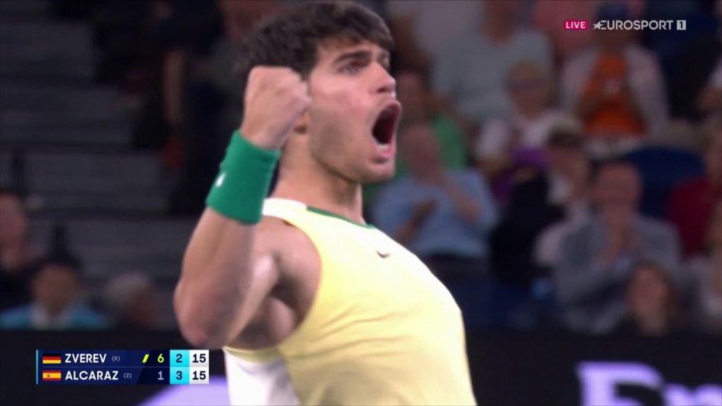 “يقاوم كارلوس ألكاراز ببعض الضربات الأمامية القاسية ضد ألكسندر زفيريف في ربع نهائي بطولة أستراليا المفتوحة. قم ببث أفضل مباريات التنس، بما في ذلك بطولة أستراليا المفتوحة 2024، مباشرة على Discovery+، وتطبيق Eurosport وعلى موقع EUROSPORT.com”