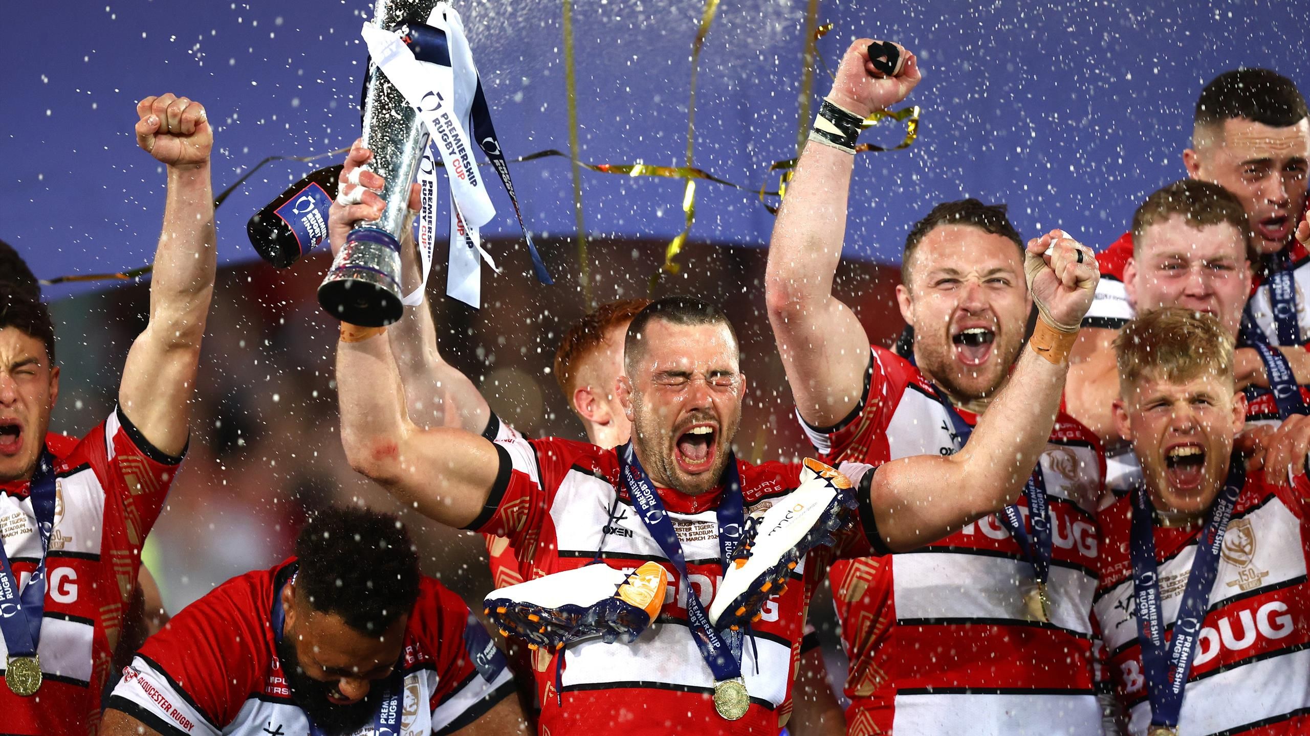 “أنهى جلوستر انتظاره الذي دام تسع سنوات تقريبًا للحصول على الكأس بفوزه 23-13 على ليستر تايجرز في نهائي كأس الرجبي الممتاز. محاولتان سريعتان من سيب أتكينسون وكام جوردان في الشوط الثاني وضعت الكرز والبيض سيطروا على المباراة أمام جماهيرهم على ملعب كينغشولم حيث انتزعوا لقبهم الأول منذ كأس التحدي 2015.