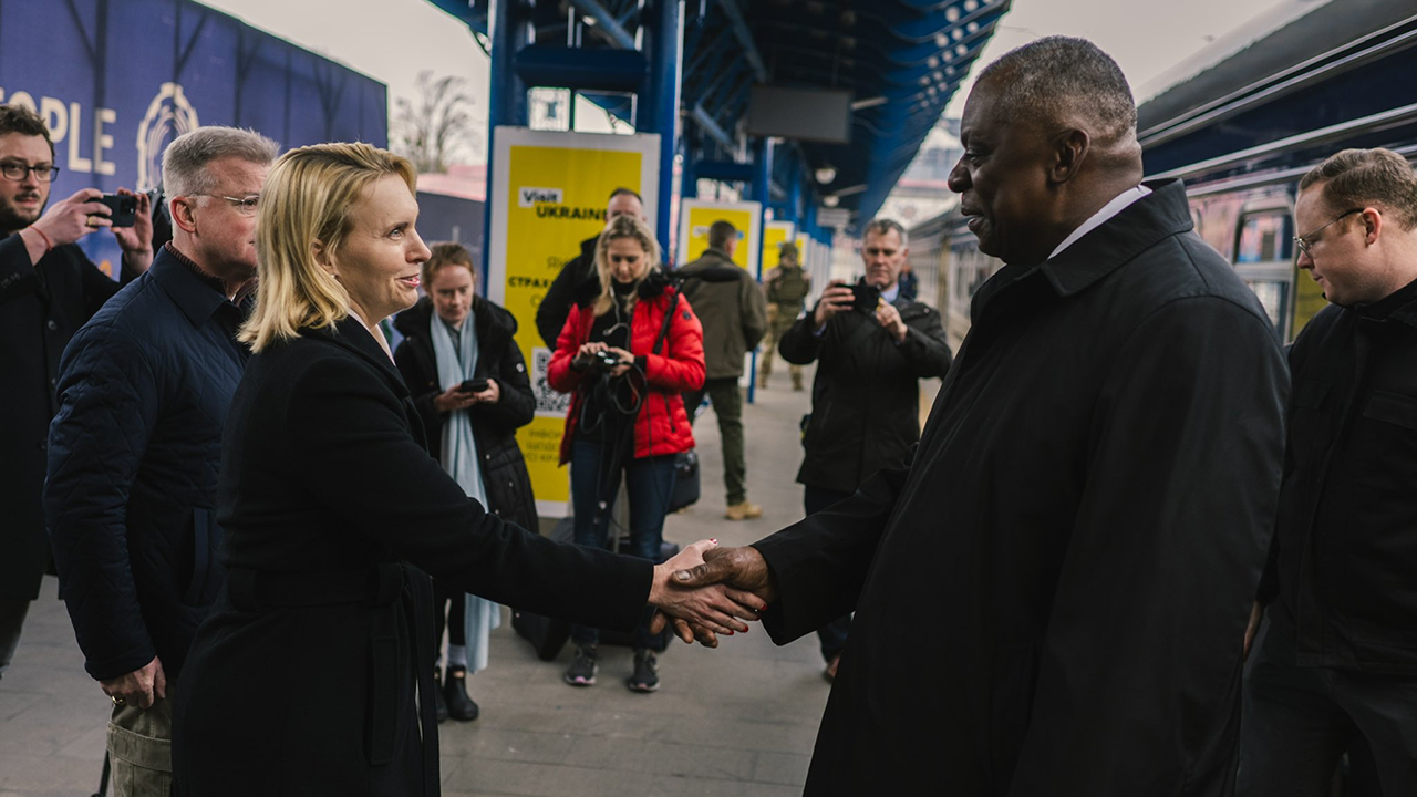 وبعد رحلة بالقطار استغرقت 11 ساعة من بولندا إلى أوكرانيا، خرج أوستن إلى الرصيف، حيث صافح سفيرة الولايات المتحدة لدى أوكرانيا بريدجيت برينك. ملحق الدفاع الأمريكي العميد. وكان الجنرال كيبلينج كالر حاضرا أيضا لتحيته.